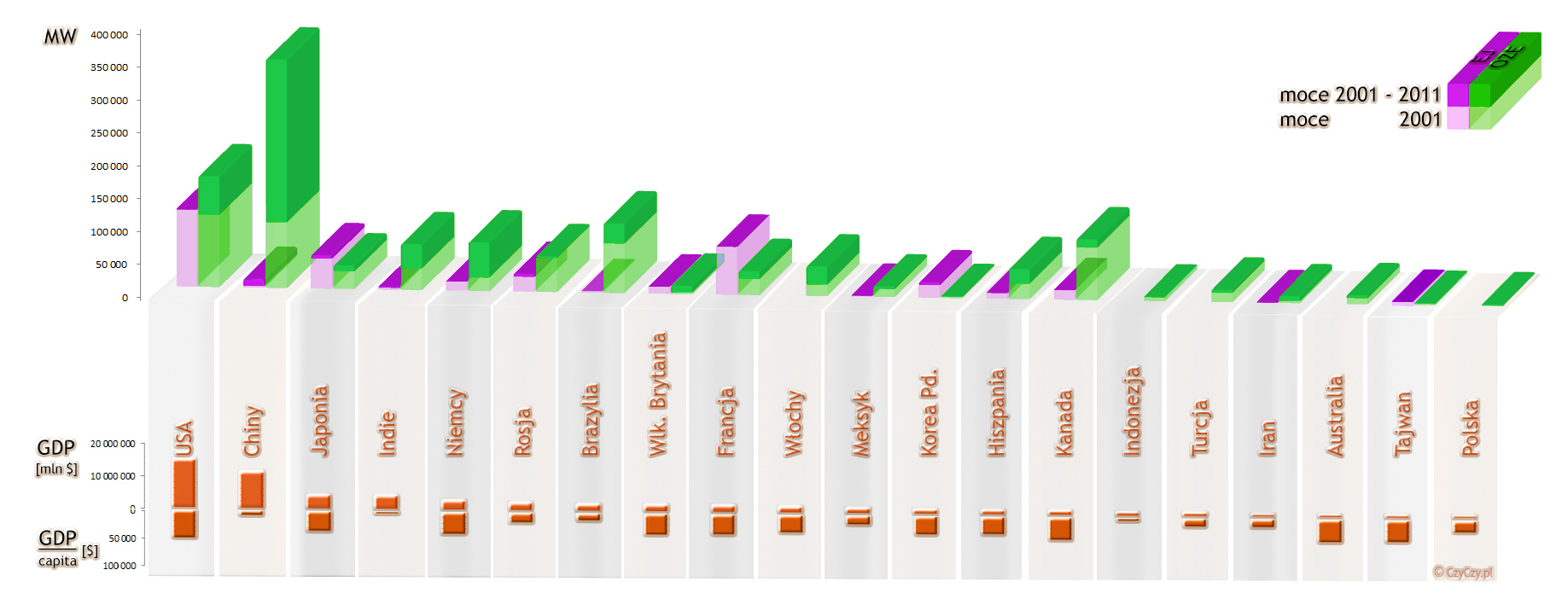Do analizy zostało wzięte 20 największych gospodarek świata (PKB według parytetu siły nabywczej, dane Międzynarodowego Funduszu Walutowego za rok 2011). Dla porównania tym razem odnieśliśmy się tylko do faktów porównując moce dostępne 10 lat temu oraz ich przyrost w ostatniej dekadzie dla każdego z tych krajów.