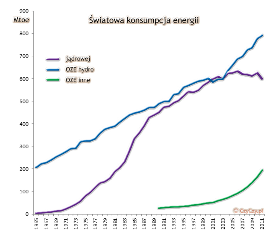 Światowe zużycie energii EJ/OZE (1965-2011)